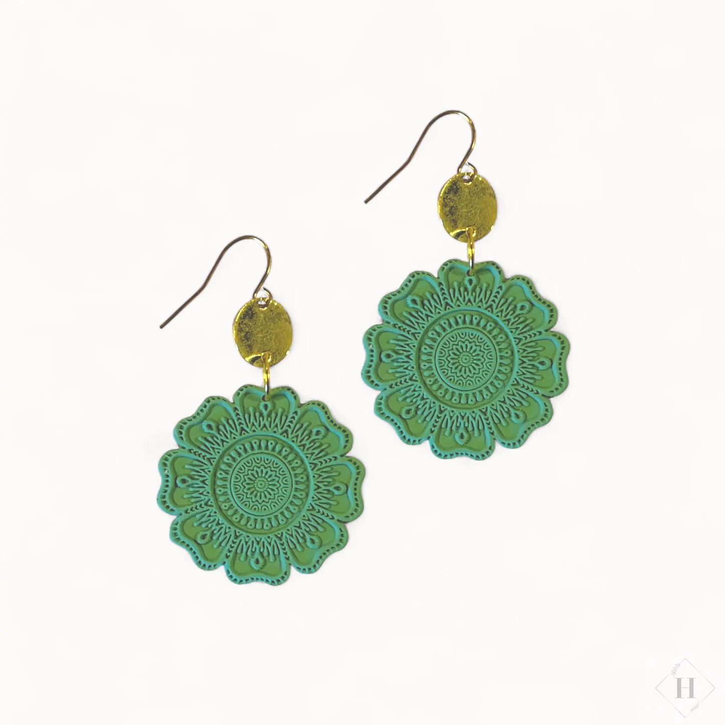 Smuk ørering i boheme stil med messing mønt foroven og krog.