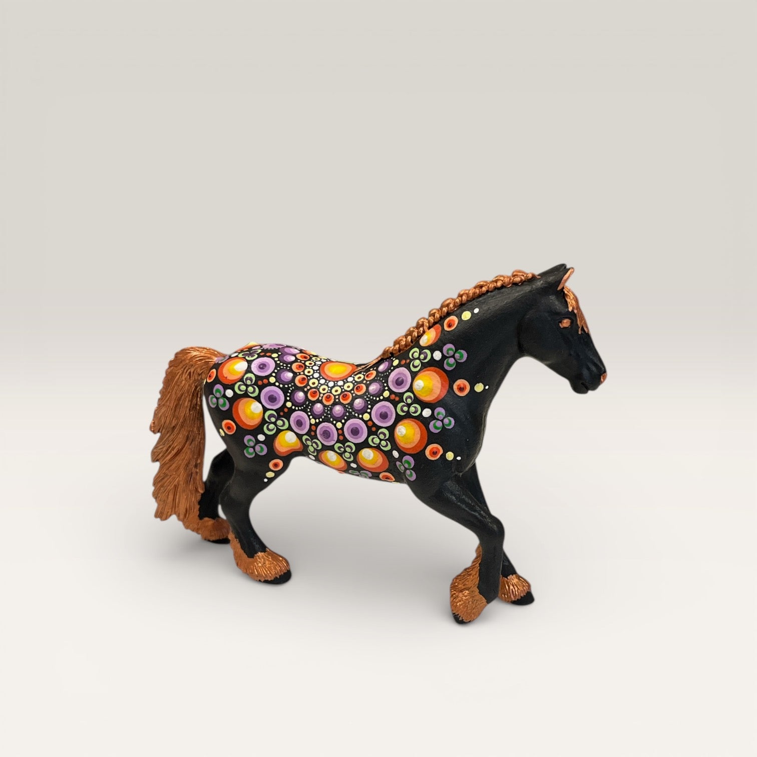 Dotart-teknikken giver hesten et levende, farverigt udtryk hvor hvert punkt er sat med præcision. Den originale hest fra genbrugen har fået en helt ny identitet gennem den håndmalede dekoration - et perfekt eksempel på hvordan genbrug kan blive til kunst.
