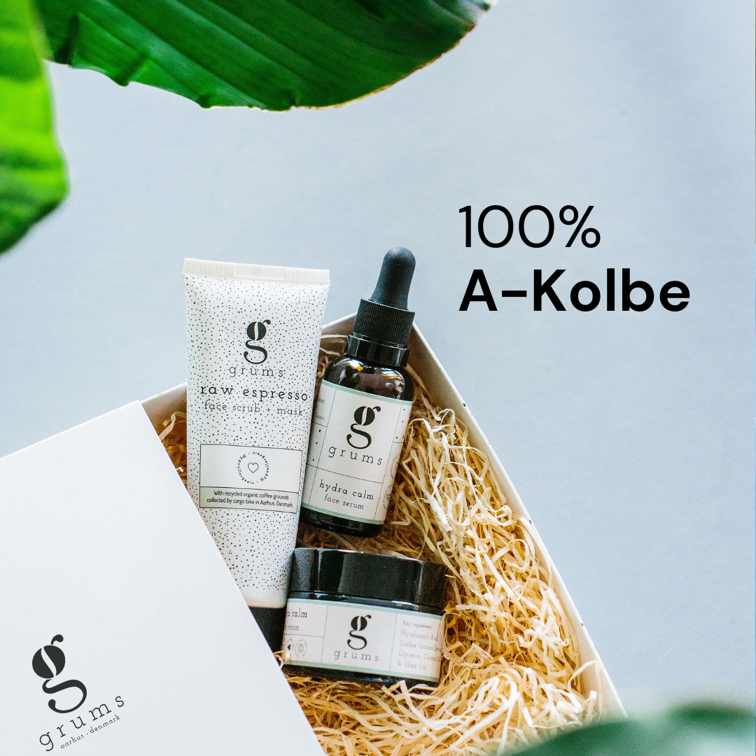 grums raw espresso face scrub + mask giver en dyb, men skånsom rens af huden. Den kombinerer peeling og maske i ét produkt, baseret på naturlige ingredienser og espresso-kaffegrums indsamlet fra lokale kaffebarer i Aarhus.