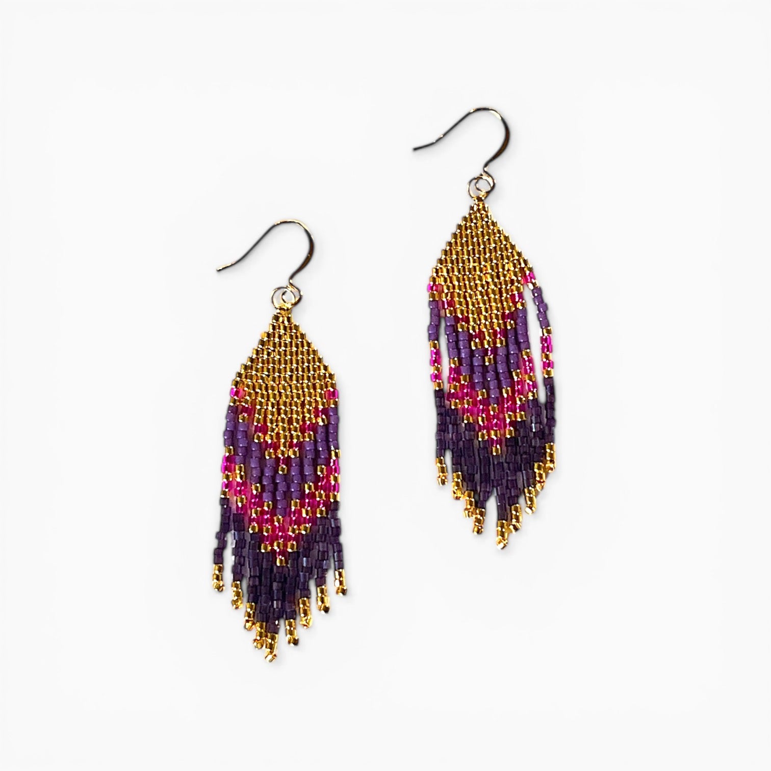Disse håndlavede frynseøreringe i miyuki perler med harmoniske lilla nuancer er skabt af Mabalser i hendes eget værksted. Hver perle er omhyggeligt udvalgt og sat sammen med præcision. De 7 cm lange øreringe er lette at bære og tilføjer et unikt, farverigt touch til både hverdag og fest.