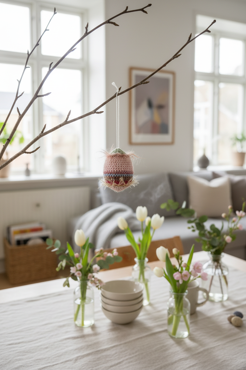 Dette påskeæg er skabt af Møhlde i hendes eget værksted, hvor hvert æg hækles med omhu. Det er ikke bare et påskeæg — det er et stykke dansk håndværk til din hverdag.