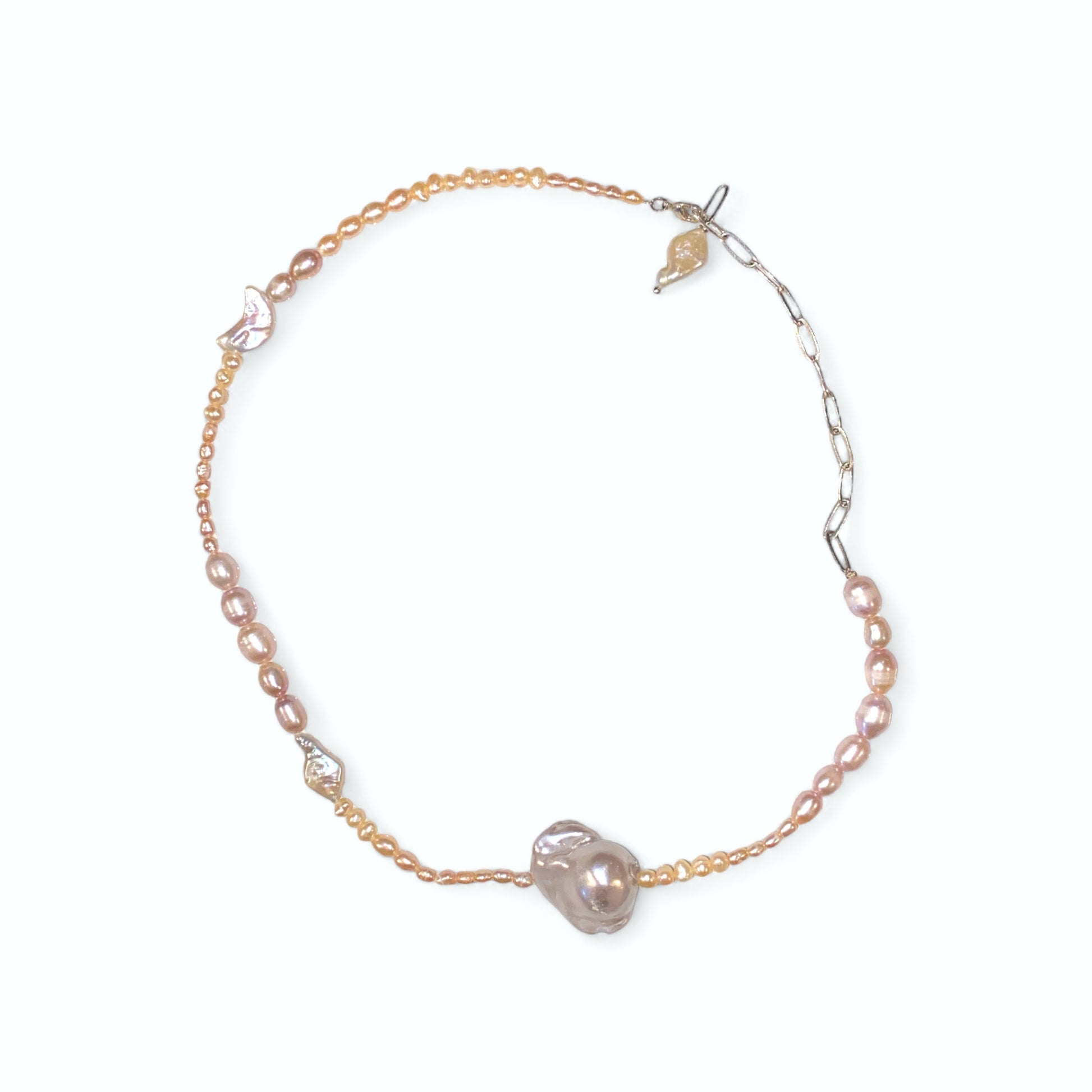 Halskæden har både store barok ferskvandsperler, Rosa ferskvandsperler og helt små ferskvandsperler samt et stykke med forsølvet kæde med store led.