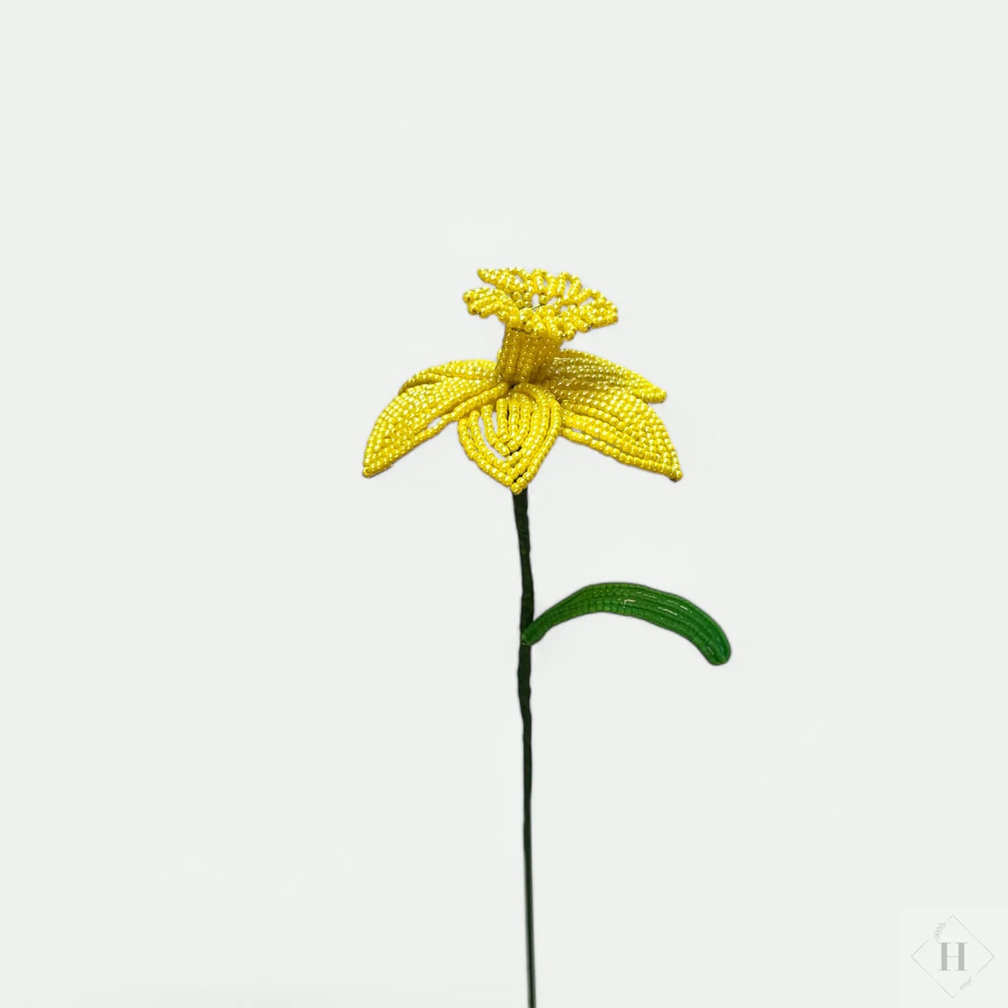 Bring et strejf af forårets skønhed ind i dit hjem med denne smukt håndlavede påskelilje i glasperler. Hver detalje er omhyggeligt udført med kvalitetsperler, som giver blomsten en livagtig og farverig udstråling.