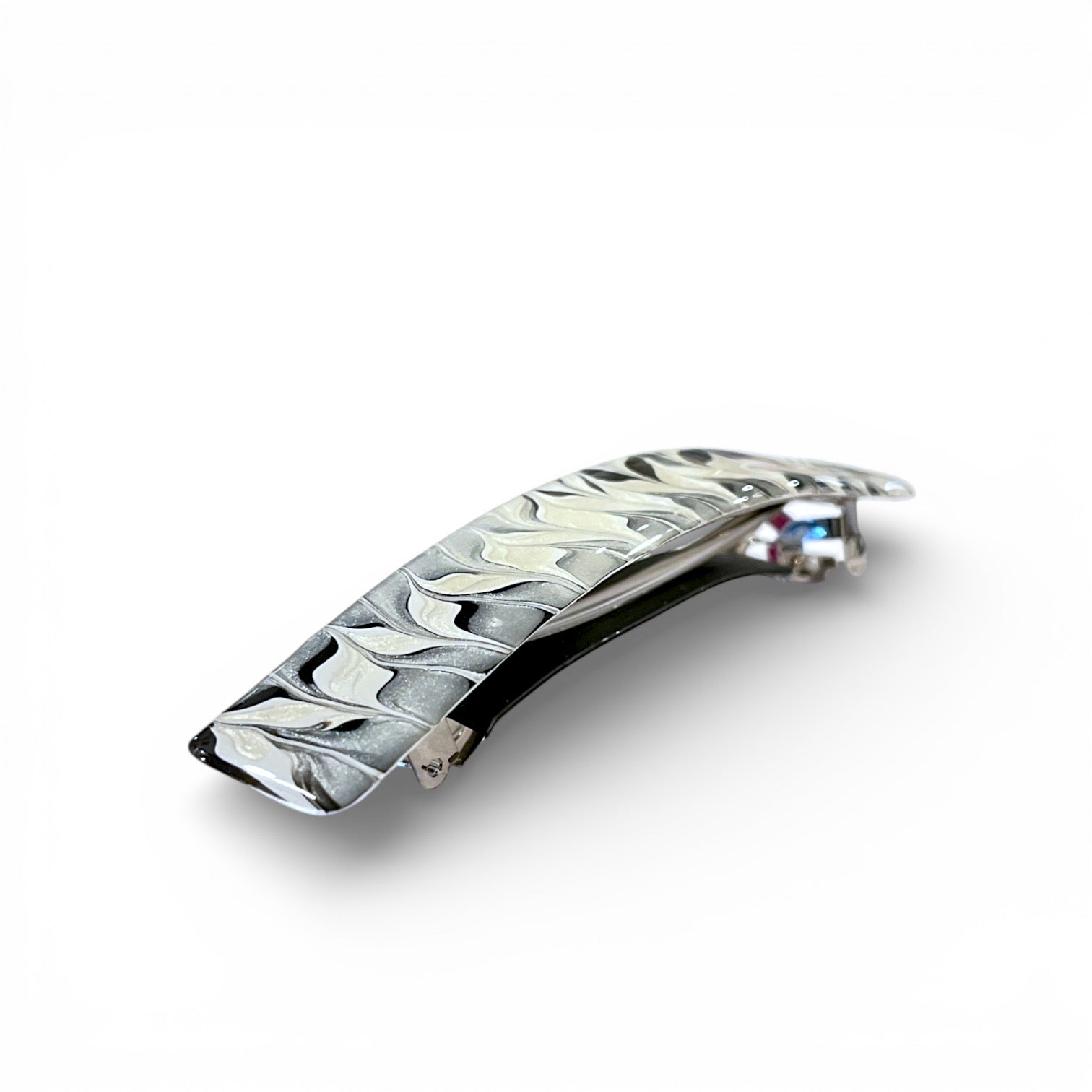 Dette hårspænde er virkelig noget særligt. Det er håndmalet i smukke sort/hvide nuancer med grafiske mønstre og derefter lakeret med resin, så det får en flot, holdbar finish. Den klassiske sort/hvide kontrast giver spændet et elegant og tidløst udtryk.
