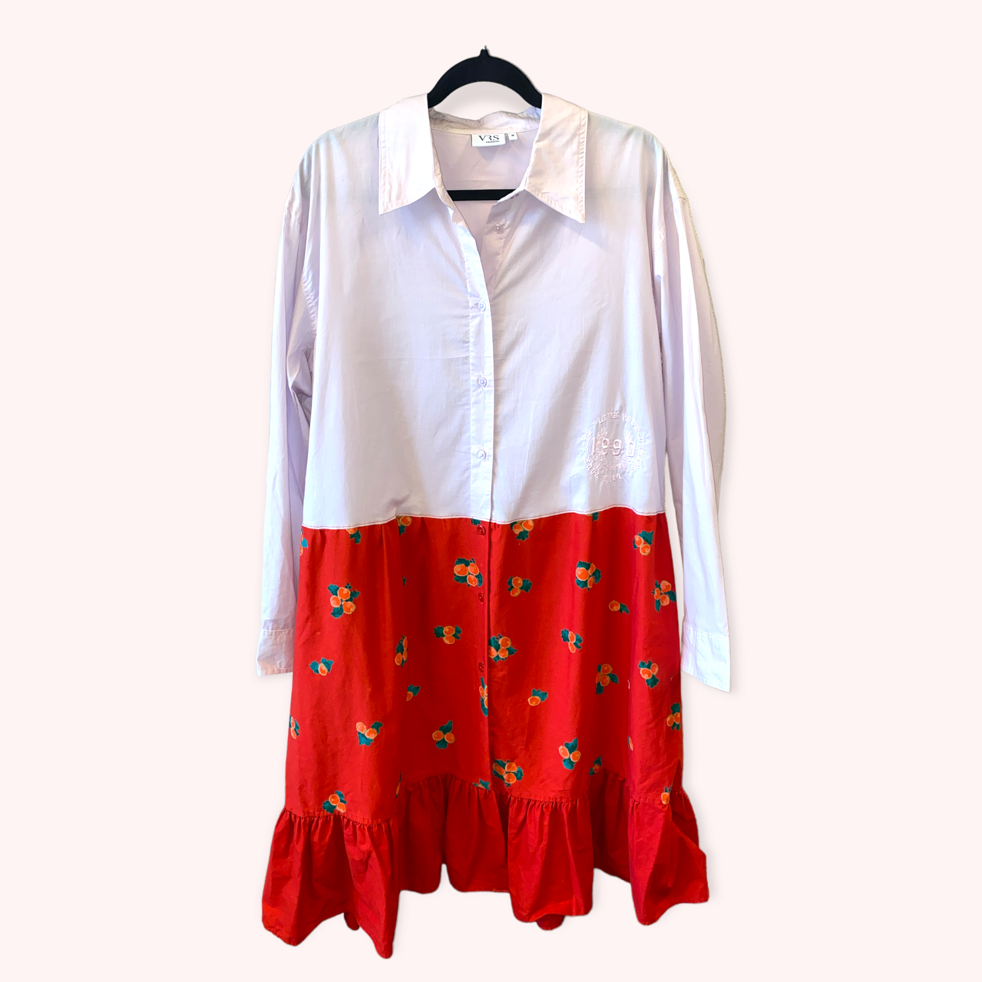 Kjolen er med en lys Rosa skjorte foroven og en upcyclet juledug forneden.