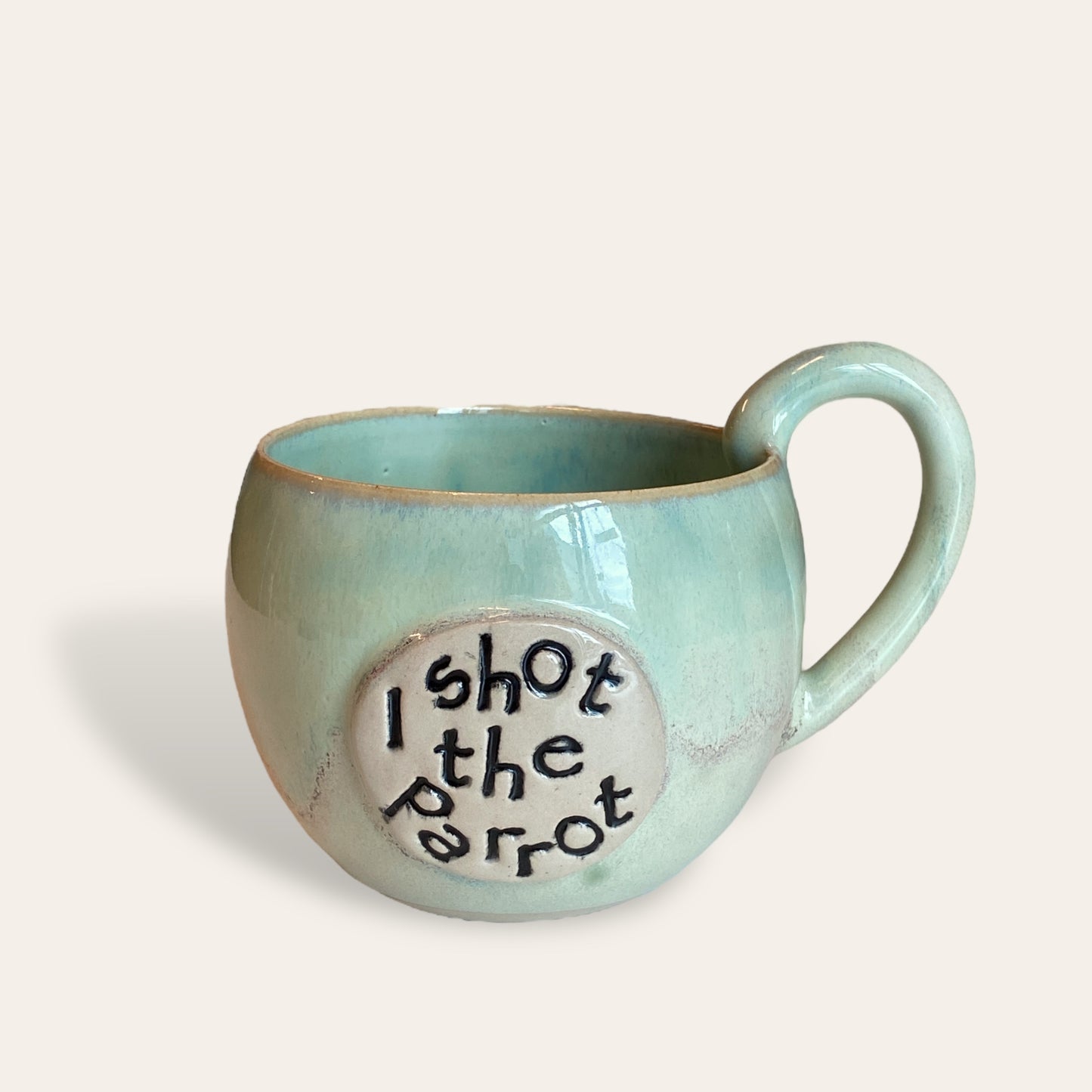 Det fineste krus med dejlig stor hank og skriften “I shot the parrot” i et banner nederst.