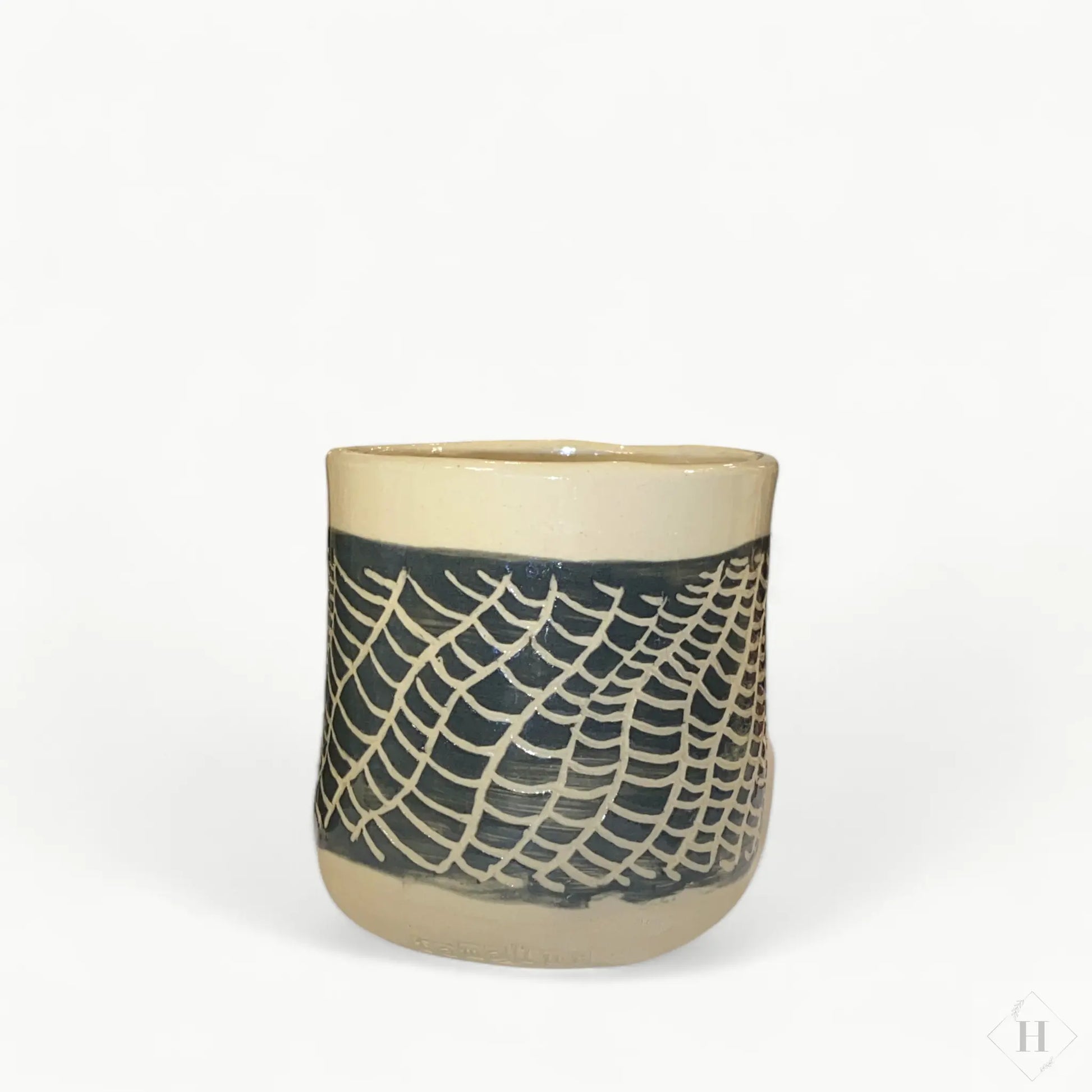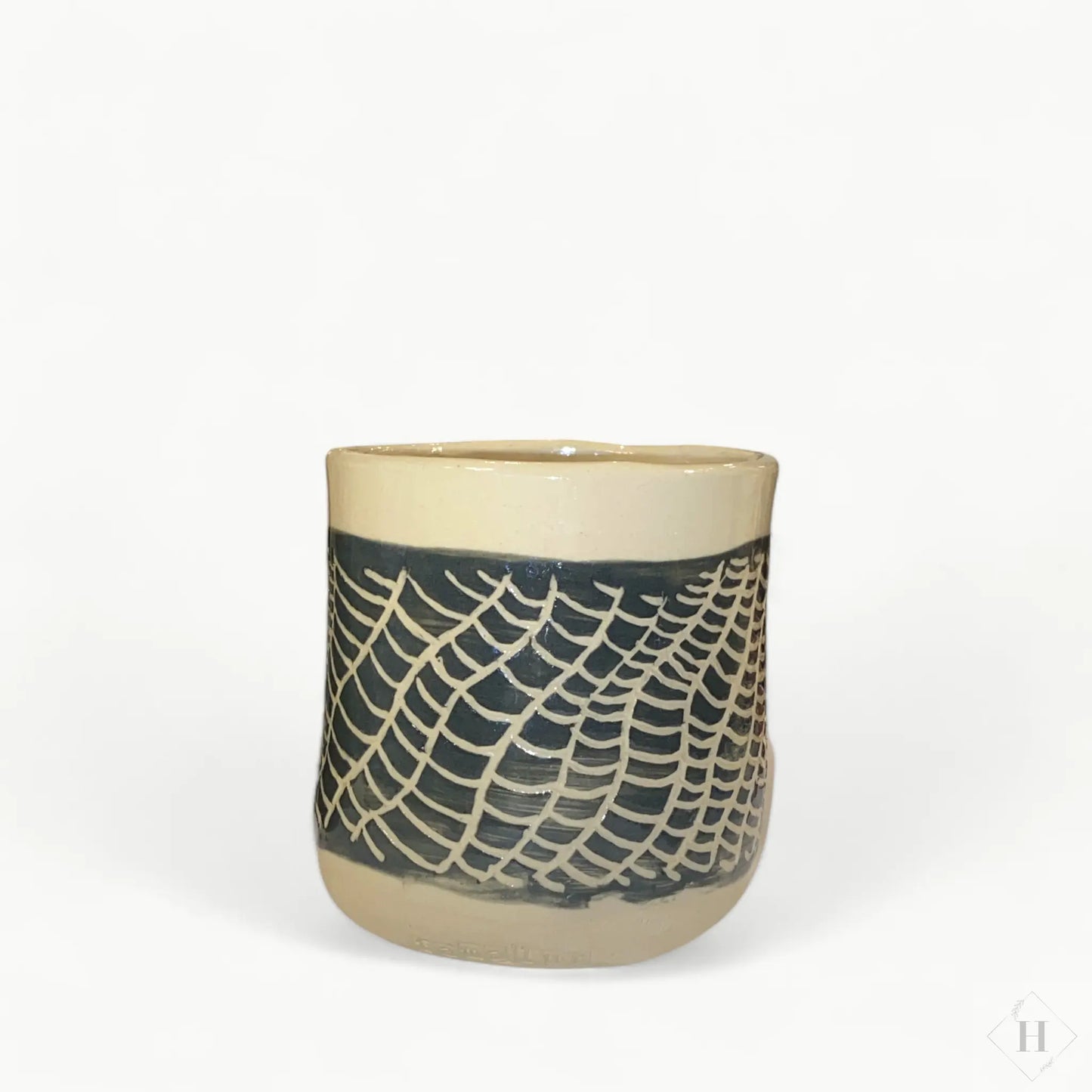Smuk og enkel håndformet kop dekoreret med et ridset geometrisk mønster.
