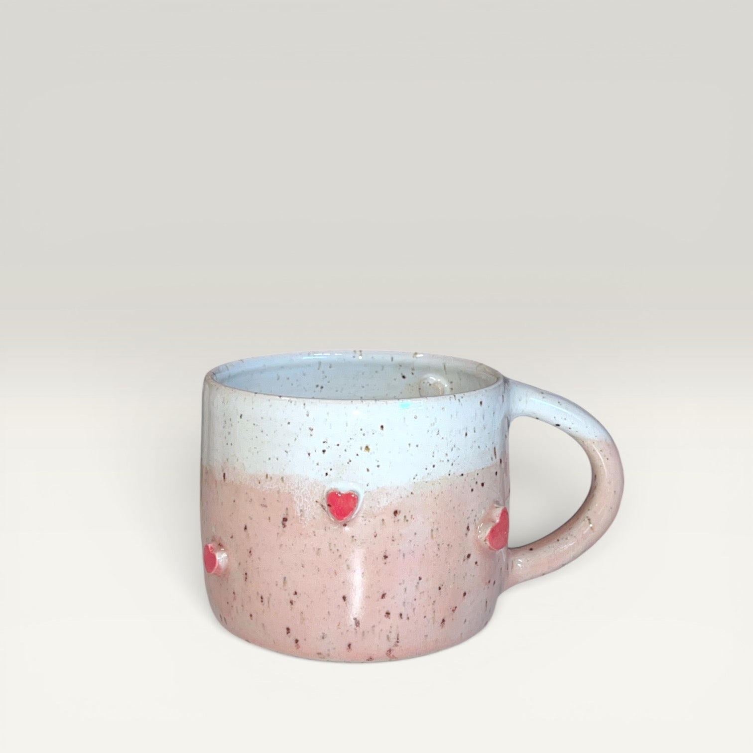 Dette håndlavede keramikkrus er dekoreret med små hjerter på ydersiden, der giver kruset et legende og kærligt udtryk. Den bløde, organiske form er kombineret med de dekorative hjertedetaljer, der skaber et spil af tekstur og relief.
