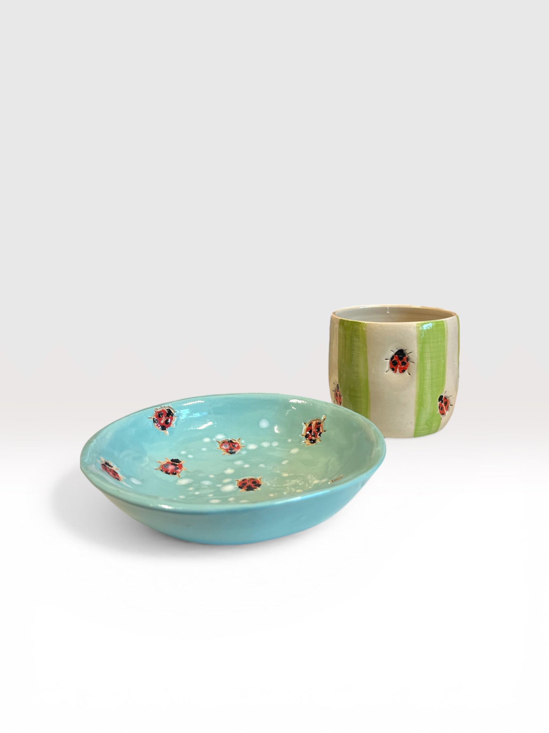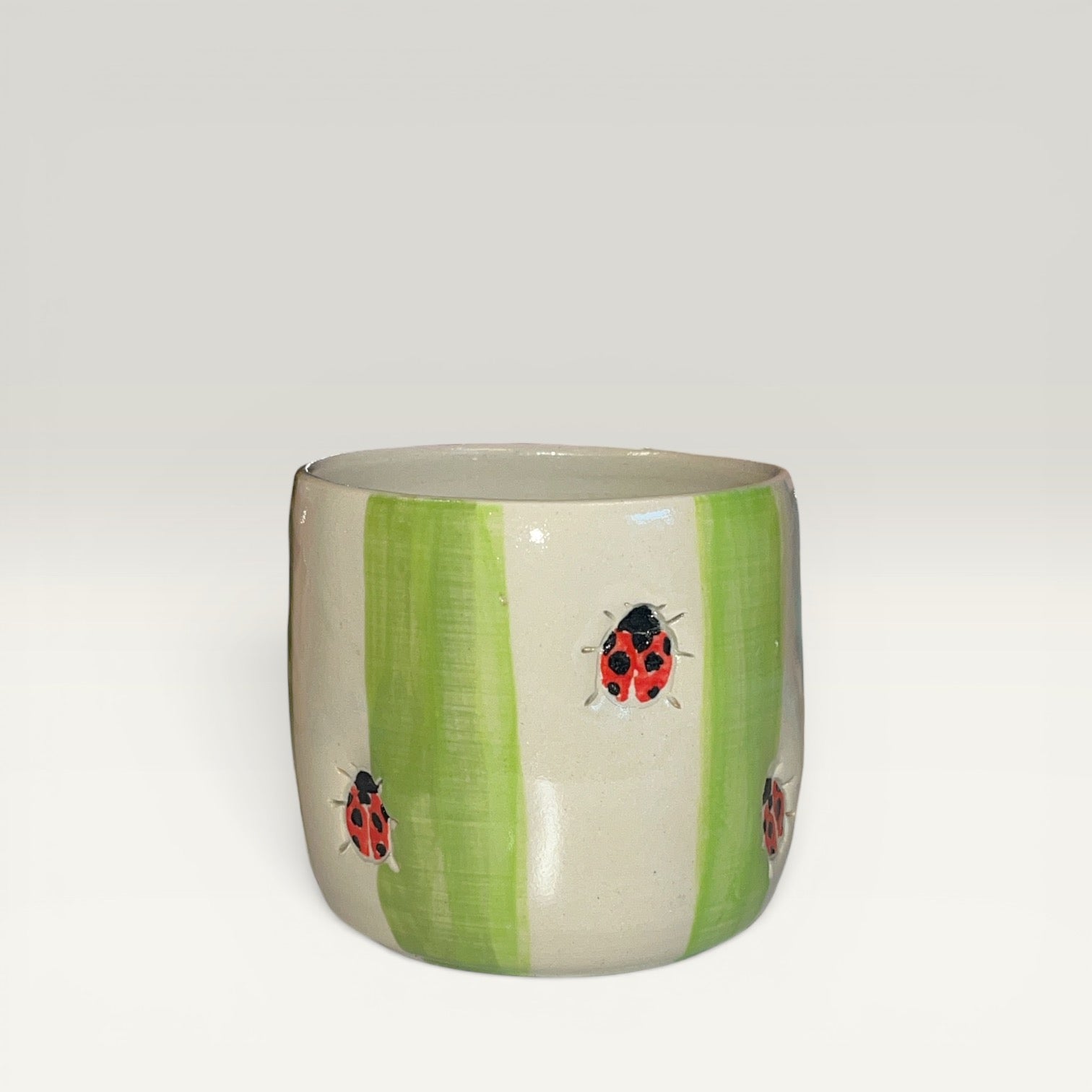 Et charmerende keramikkrus uden hank, prydet med en lille mariehøne der kravler op ad siden - som en lille hilsen fra sommerens have. Kruset er formet i stentøj og brændt ved høj temperatur, så det er både robust og praktisk til hverdagen.