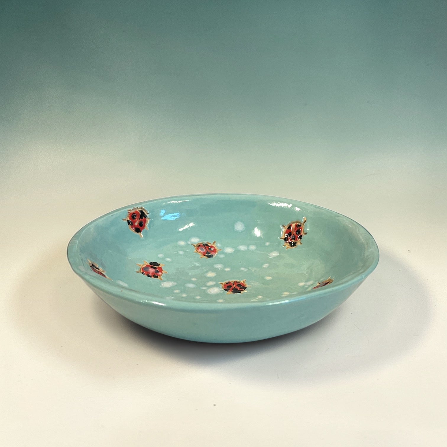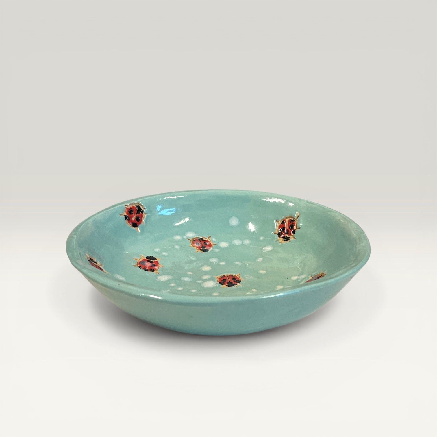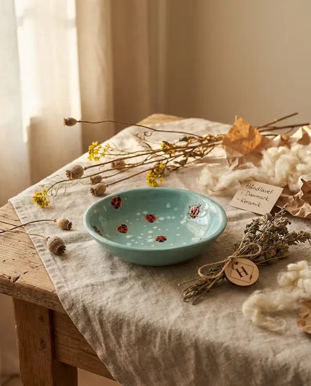 En charmerende lav keramikskål med en lille mariehøne, der kravler op over kanten - som en lille hilsen fra sommerens have. Skålen er formet i stentøj og brændt ved høj temperatur, så den er både robust og praktisk til hverdagen.