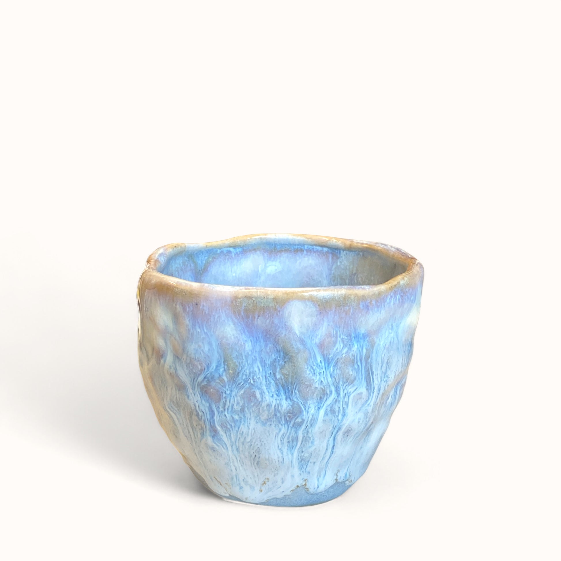 Lille fin skål med flot glasur i blå og lilla nuancer