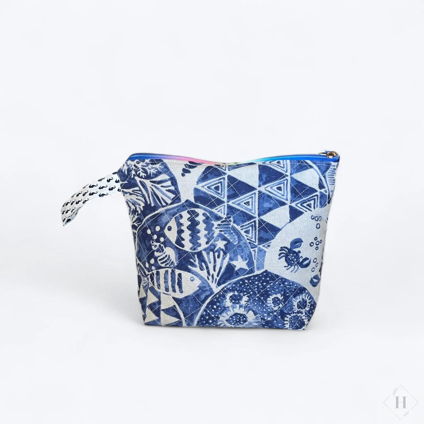 Stor praktisk toilettaske eller projekt taske i smukt maritimt print og regnbuefarvet lynlås.