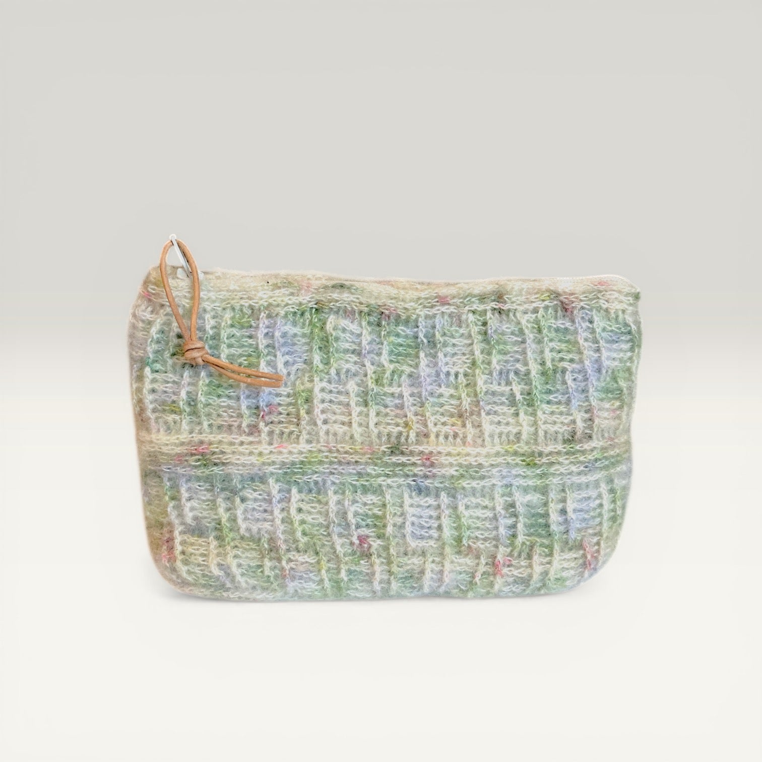 Pungen er hæklet i blød, grøn silk mohair på nål 1.25 for den fineste finish — silkeblød at røre ved og smuk at se på. Den har et plantefarvet bomuldsfoer, der giver ekstra holdbarhed og beskytter dine ejendele. Hver pung er unik, og små variationer i farve og struktur gør netop din pung til noget helt særligt.