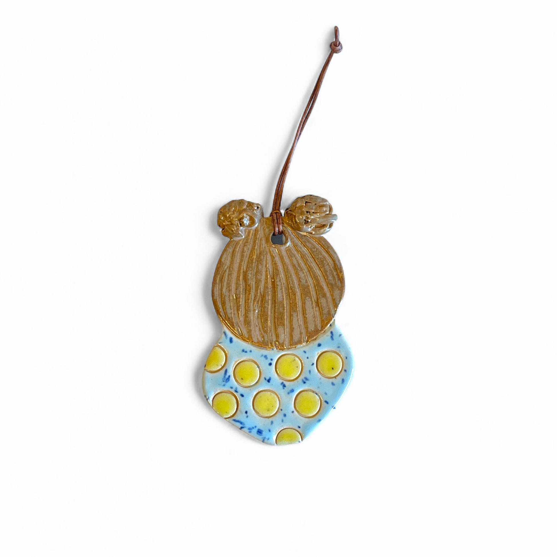 Mini spilop i keramik, dekoreret på både for og bagside, så den kan hænge frit på en gren eller lign.