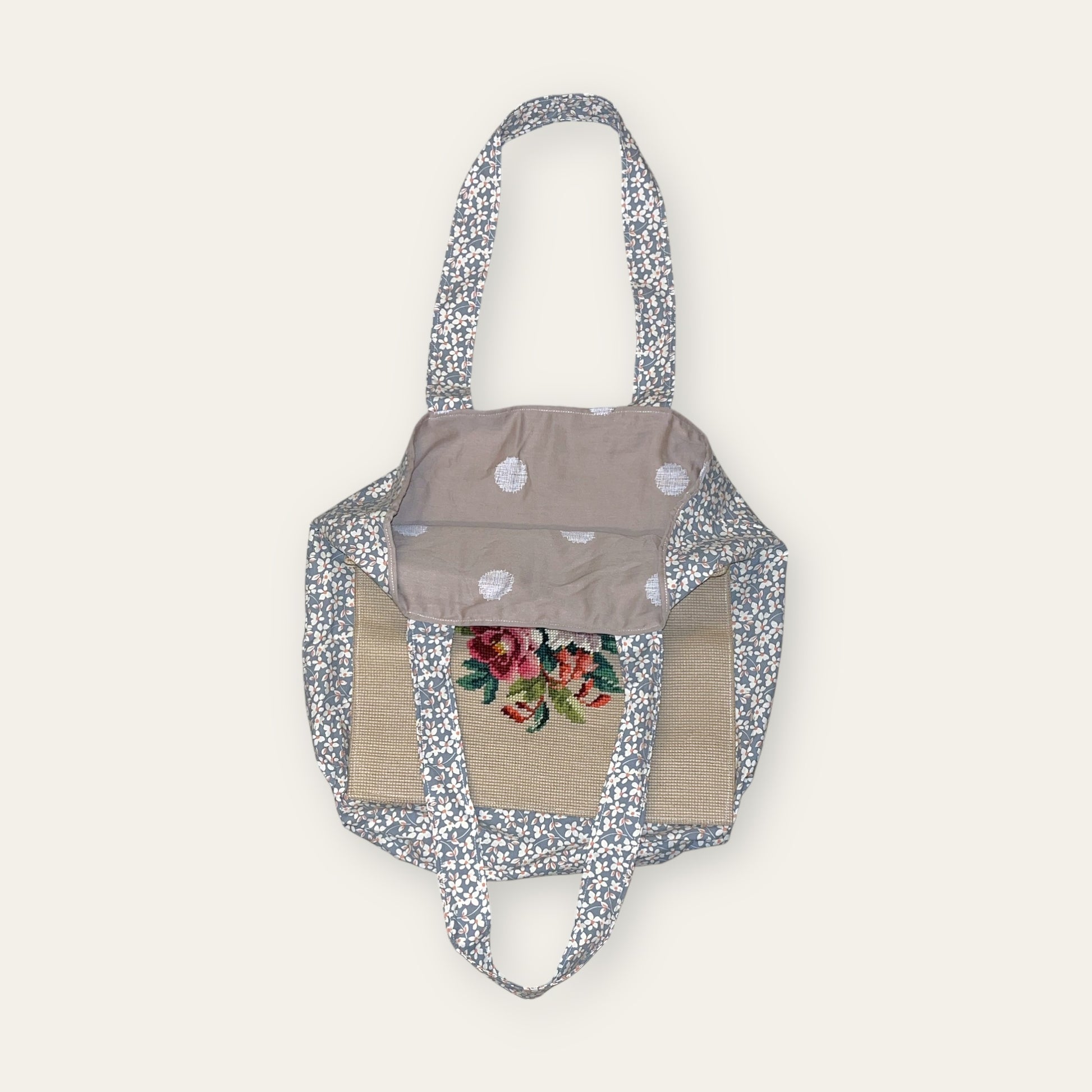 Denne smukke mulepose er syet af Irene Kokholm i upcycled stof fra genbrugen - primært bomuldsduge og sengetøj. Posen er dobbeltlaget for ekstra holdbarhed og har et fint stramaj broderi, som også er fundet i genbrugen.