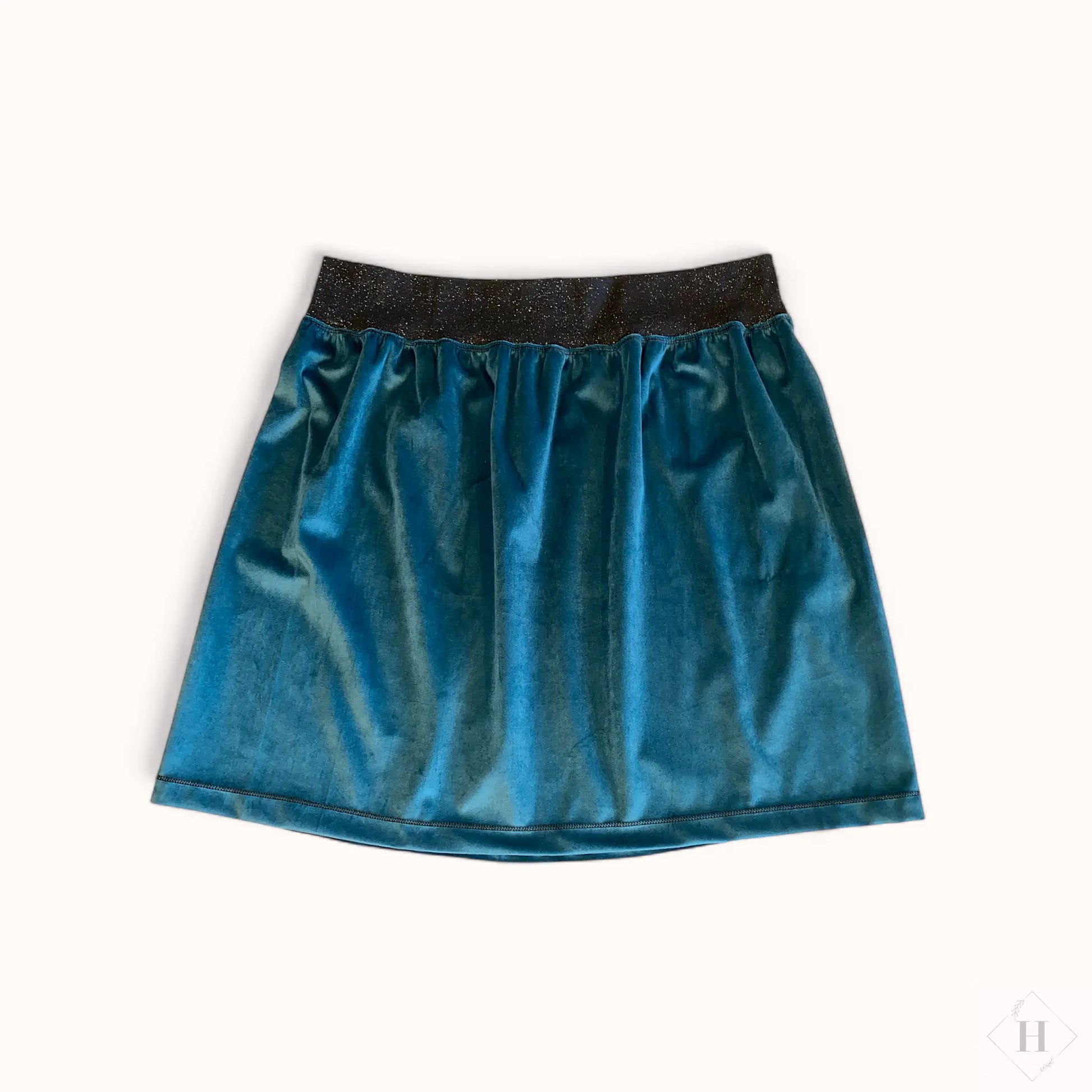 Lækker blød nederdel i kraftigt petroleumsblå velour med bred elastik med sølvglimmer i.