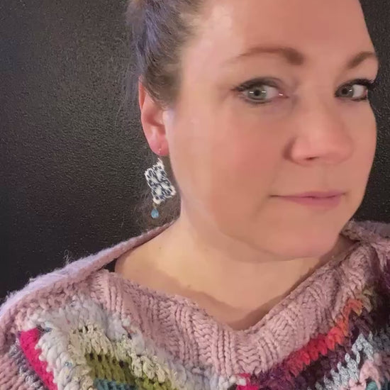 Disse håndsyede øreringe er fremstillet af Miyuki perler, kendt for deres præcision og høje kvalitet. Designet har en elegant mønster der er delt som en firkløver i blå nuancer.
