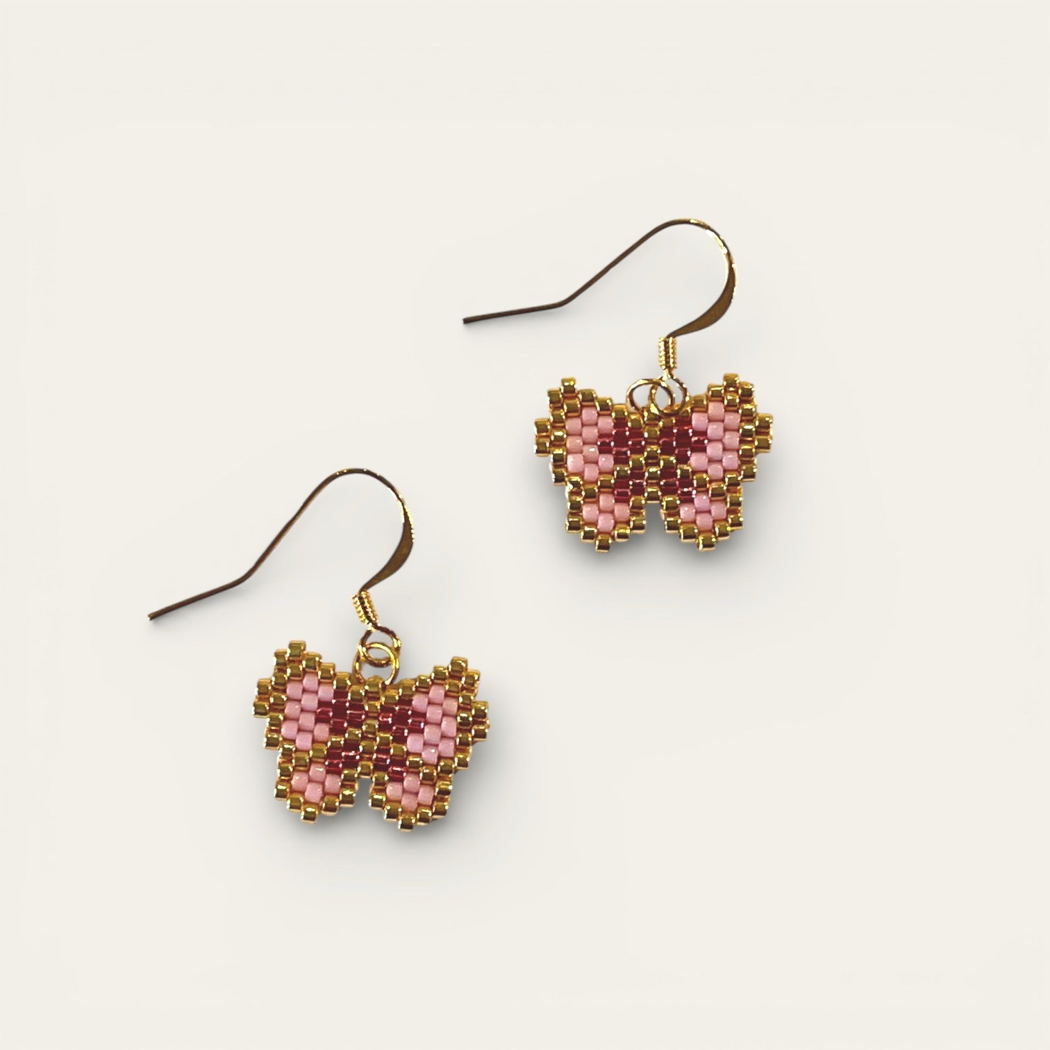 Charmerende øreringe håndlavet af miyukiperler med sødt lyserødt sommerfuglmotiv. Disse øreringe er perfekte til dig, der elsker feminine detaljer og farverige smykker, der giver dit outfit lethed og glæde.