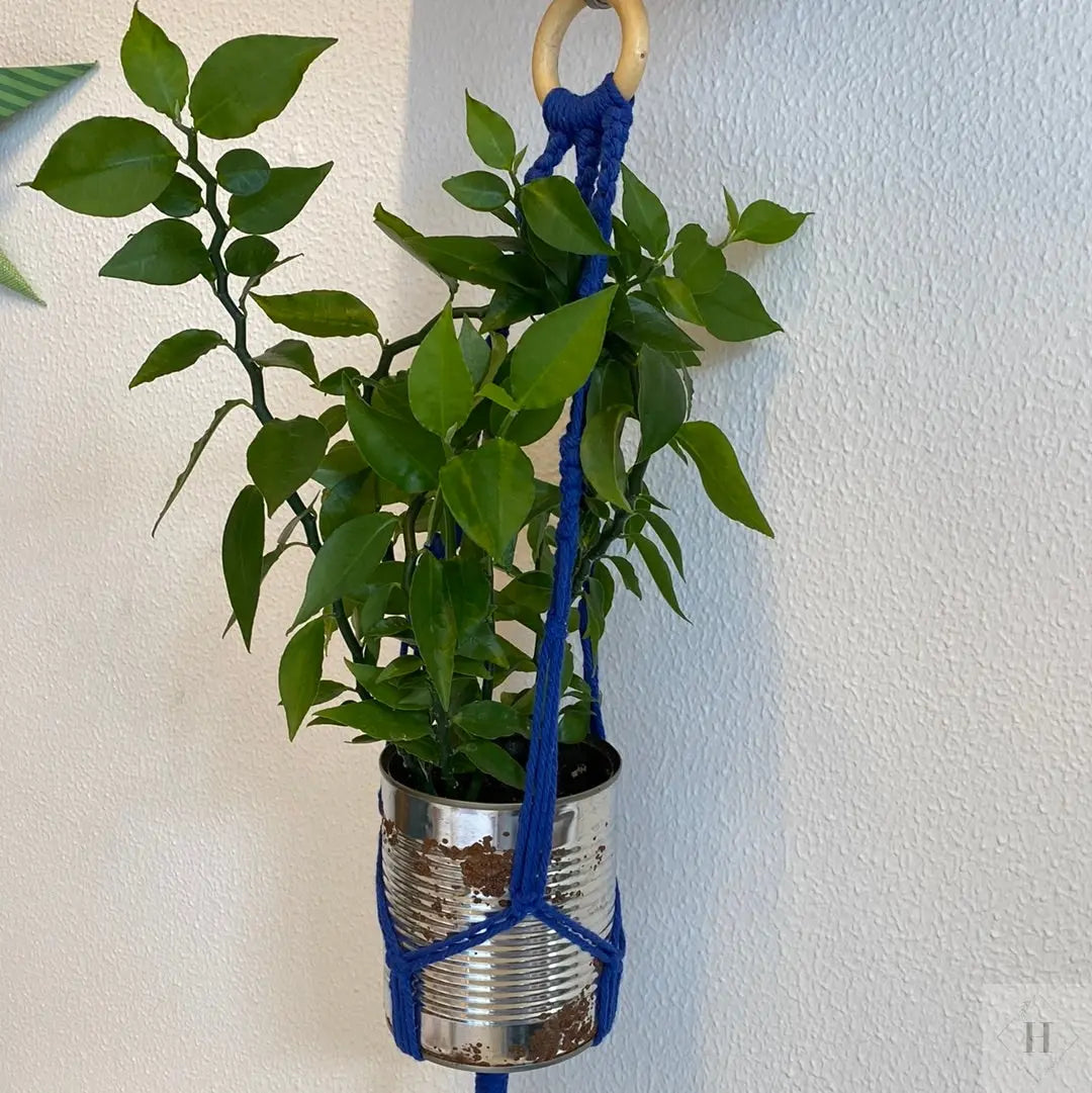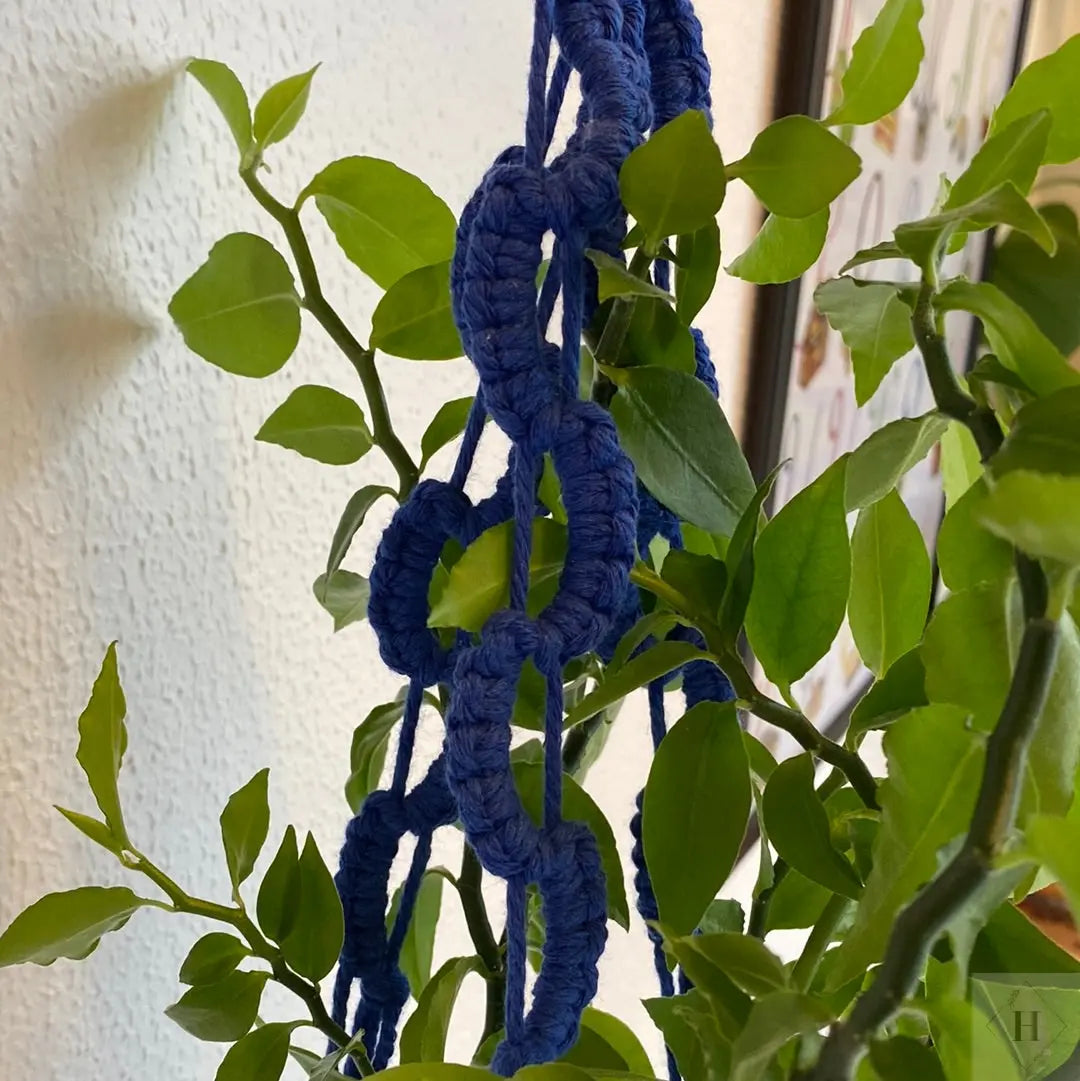Ophænget er knyttet i blåt bomuldssnor og måler 85cm fra ring til kvast.