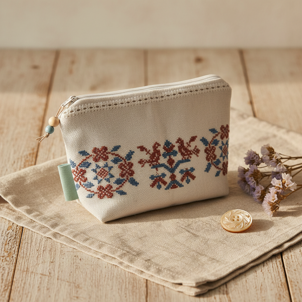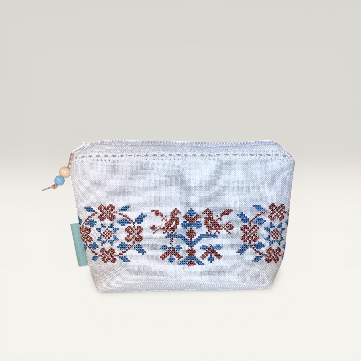Stramajen er et af de mest tålmodige håndarbejder, der findes — sting for sting, mønster for mønster. Her er den blevet til forsiden på en lille pung med padding imellem for- og bagside, så den både føles blød og beskyttende i hånden. Et stykke broderi, der nu har en ny opgave.