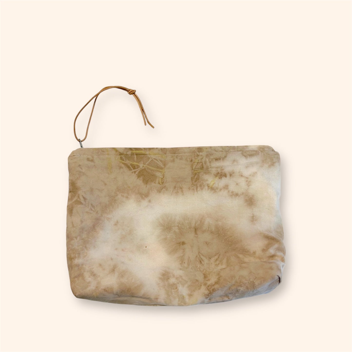 Pungen er lavet af upcyclet stof fra gamle lagner, tøj og dyne- og pudebetræk. Stoffet er plantefarvet med blandt andet kaffe, gurkemeje, avokado, rødkål og agern og er derefter brugt til at lave eget designede patchwork punge som er syet fra bunden. Pungen er med for og med en simpel lynlås tilpasset til farven på pungen selv.