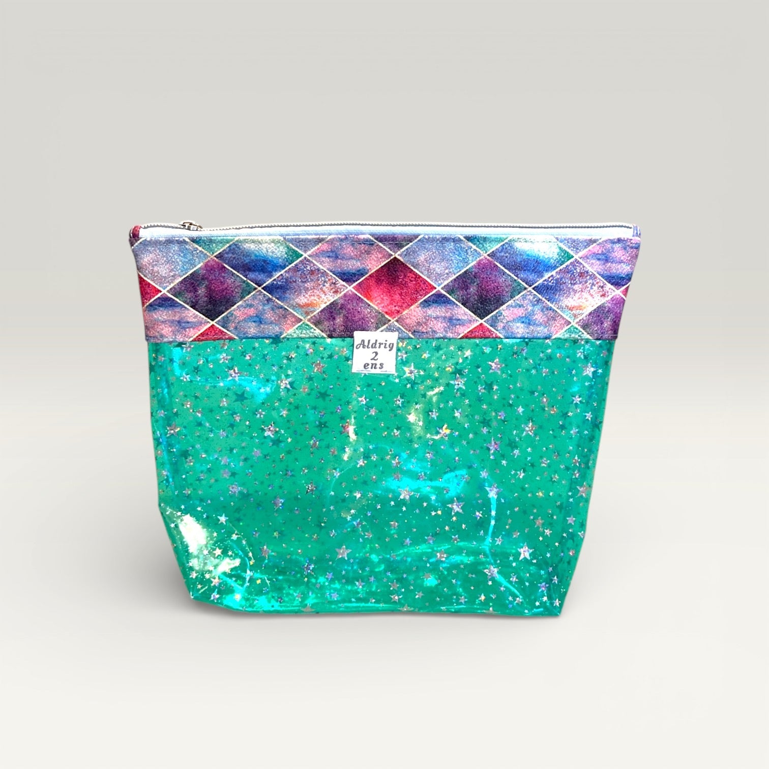 Denne håndlavede toilettaske er lavet af gennemsigtig grøn vinyl med et sødt stjernemotiv. Den gennemsigtige vinyl gør det nemt at se indholdet, så du hurtigt kan finde det du søger. Tasken er rummelig og praktisk til rejser, weekendture eller daglig brug.