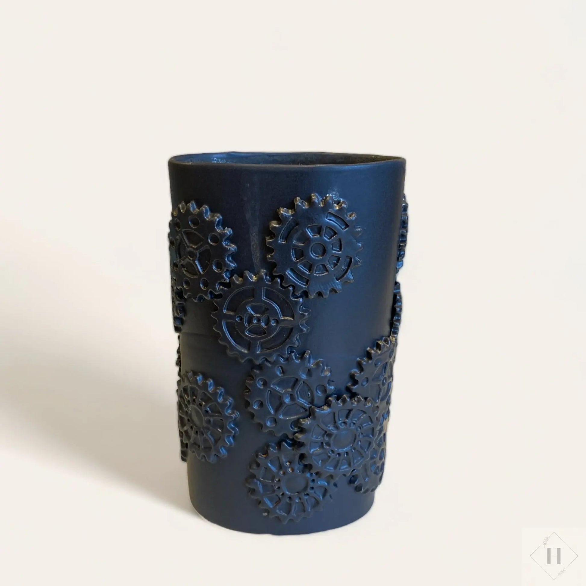 Stor vase i steampunk stil med sort glasur og dekoreret med tandhjul i keramik