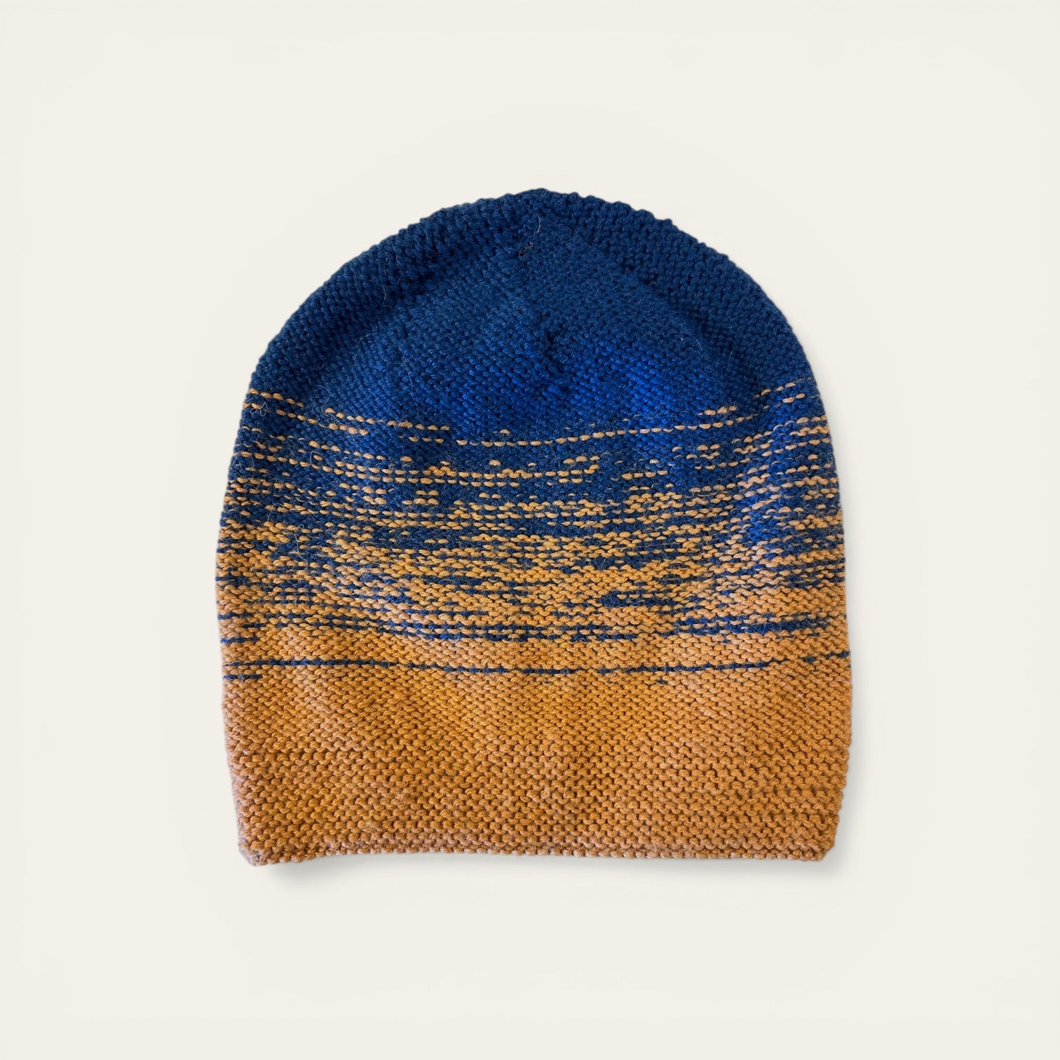 En håndstrikket hue i en varm, blå og brun farve — lavet med omhu og strikket til at holde varmen, når det gælder.