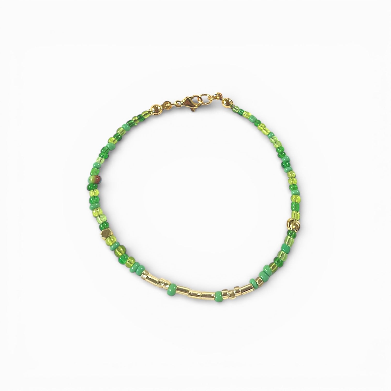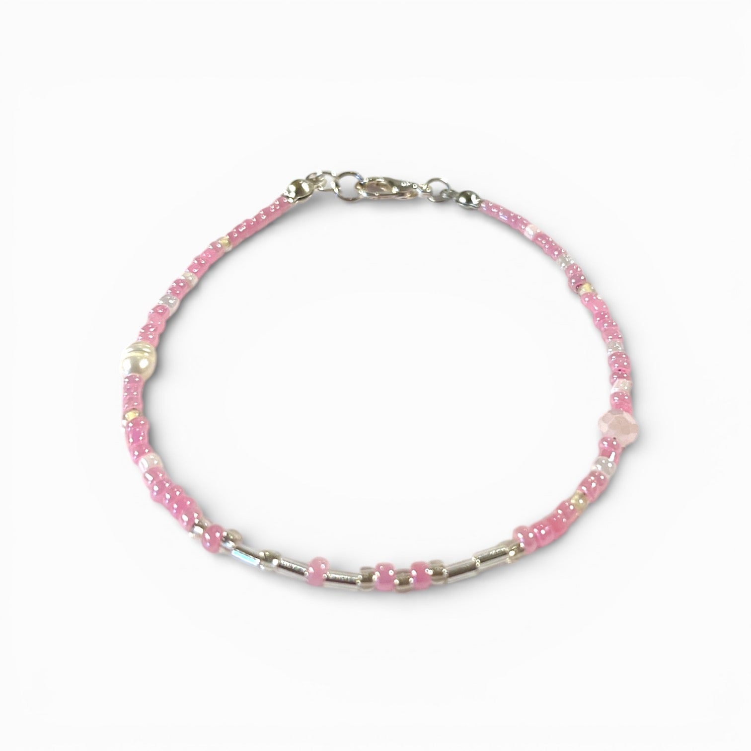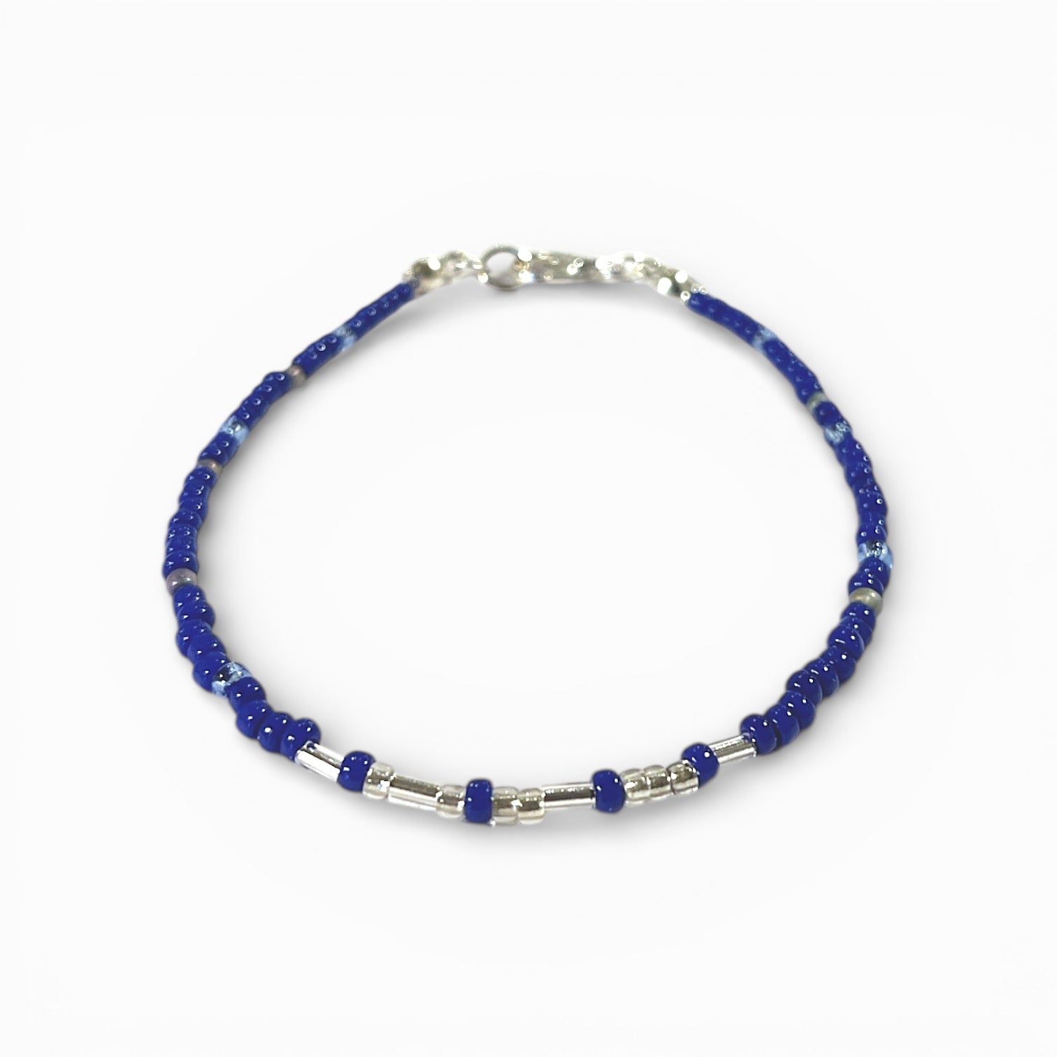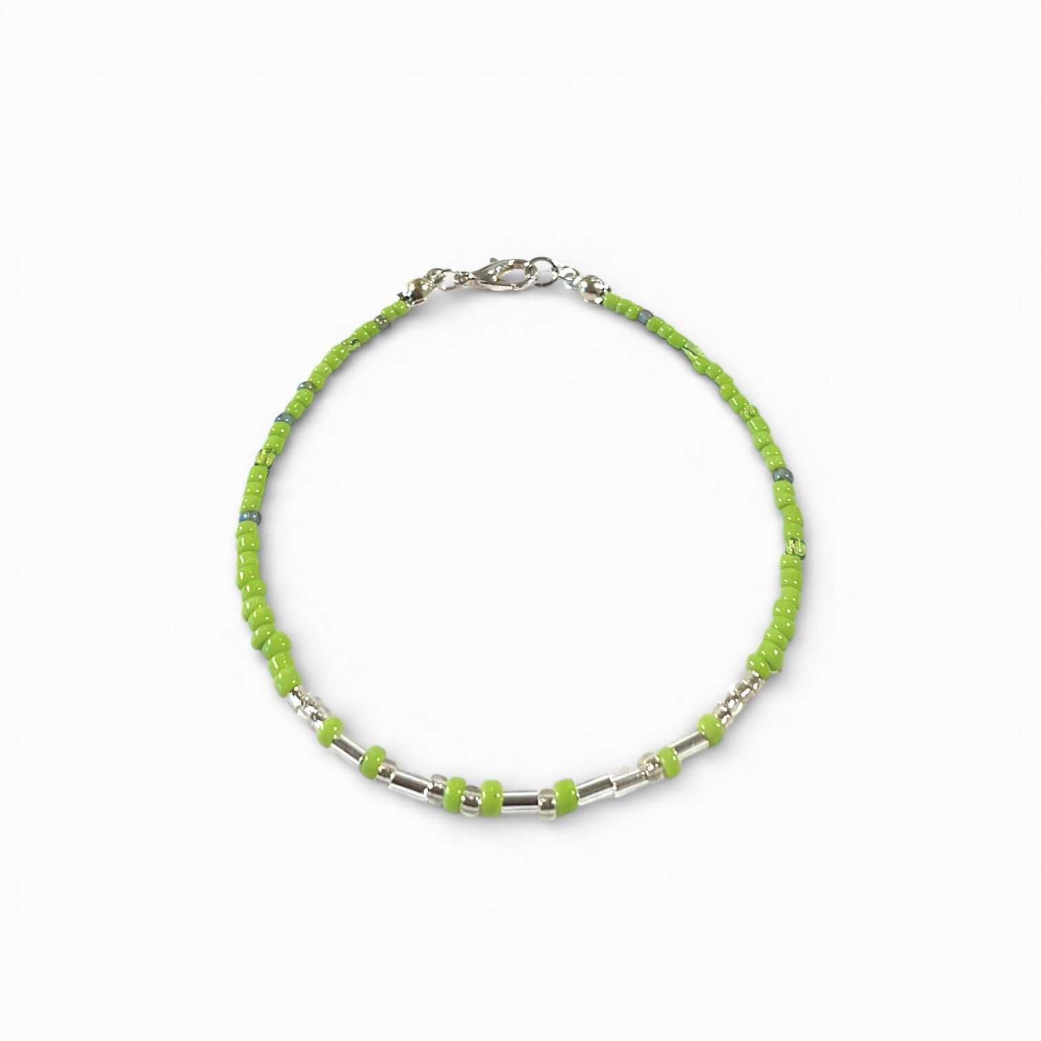 Tyndt armbånd med glasperler hvor der med Morsekode alfabetet er skrevet et ord i lange og korte perler.