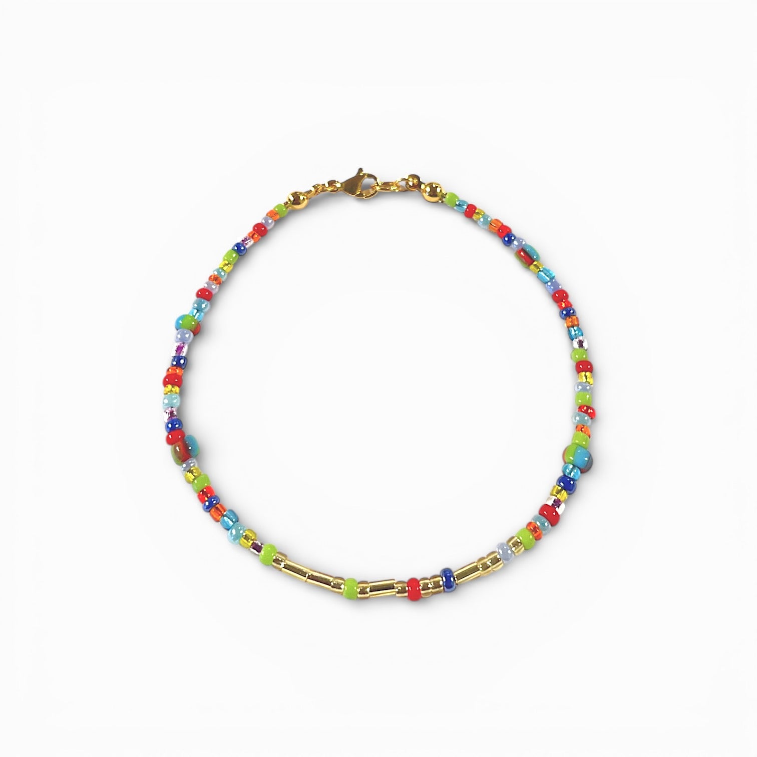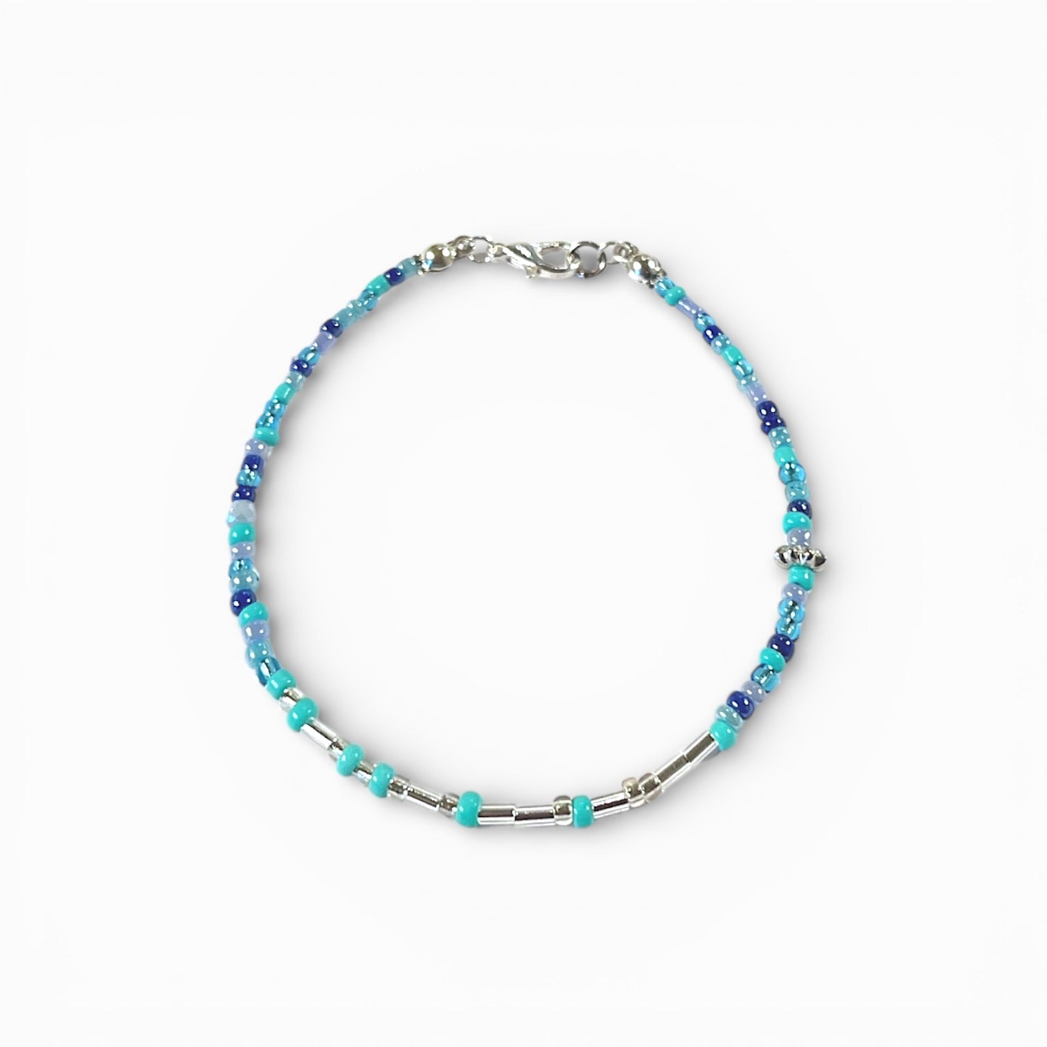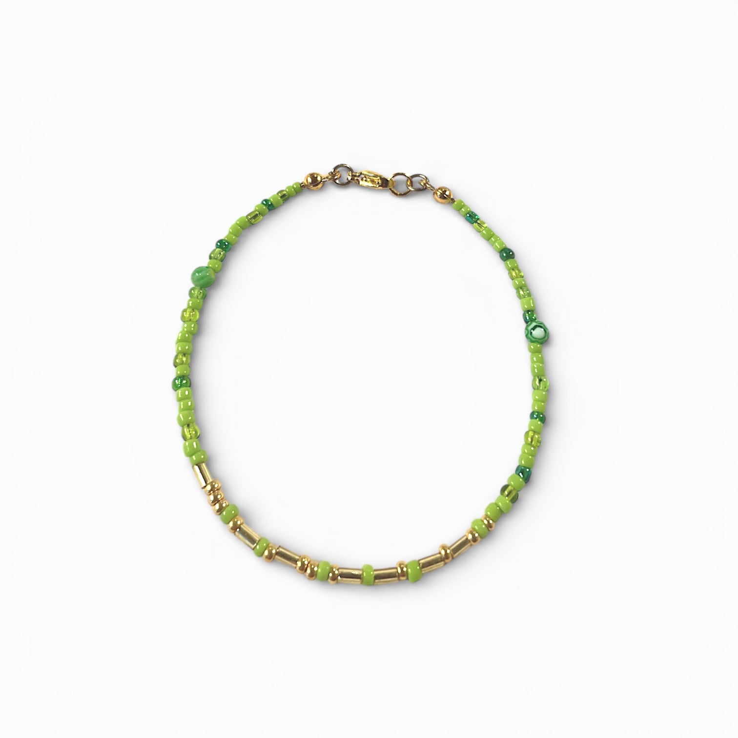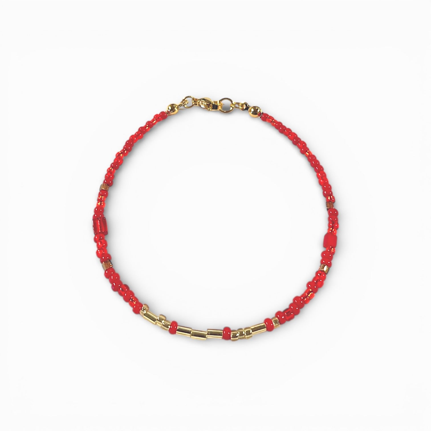 Tyndt armbånd med glasperler hvor der med Morsekode alfabetet er skrevet et ord i lange og korte perler.